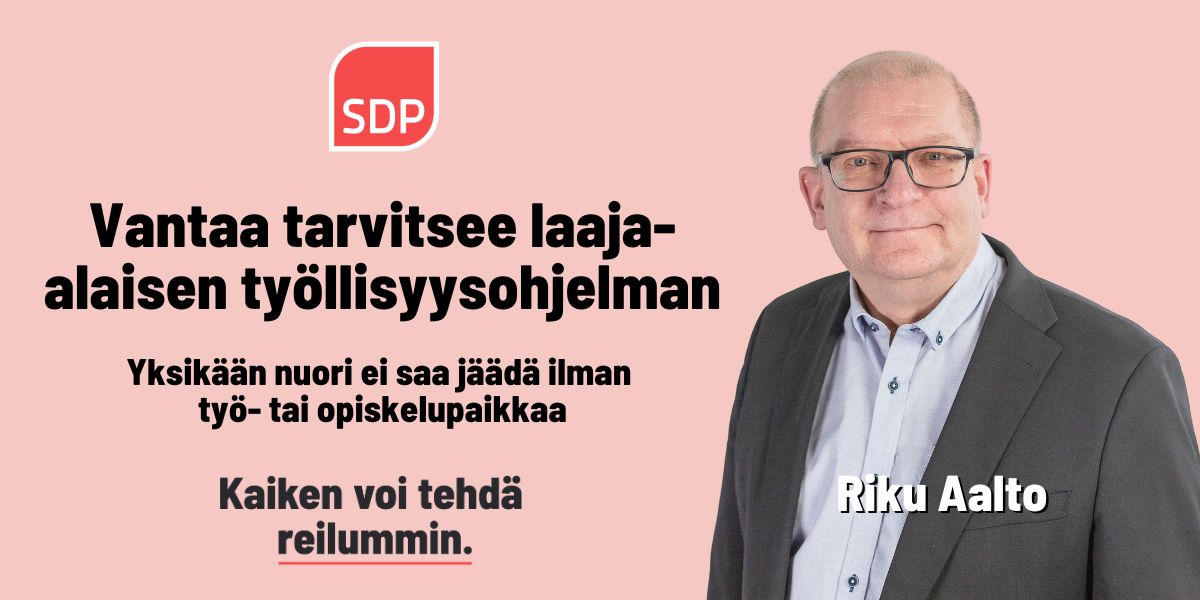 Näiden haasteiden edessä Vantaan on kaupunkina tartuttava härkää sarvista. Vantaalle on laadittava laaja-alainen työllisyysohjelma, jossa etsitään uusia keinoja työttömyyden vähentämiseksi. Työ on tehtävä ennakkoluulottomasti. Tavoitteenasettelun on oltava kunnianhimoinen: Yksikään nuori ei saa jäädä ilman työ- tai opiskelupaikkaa.